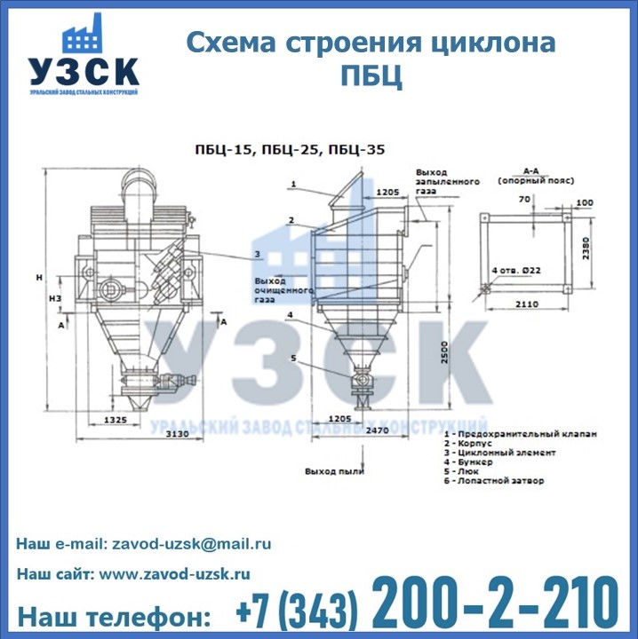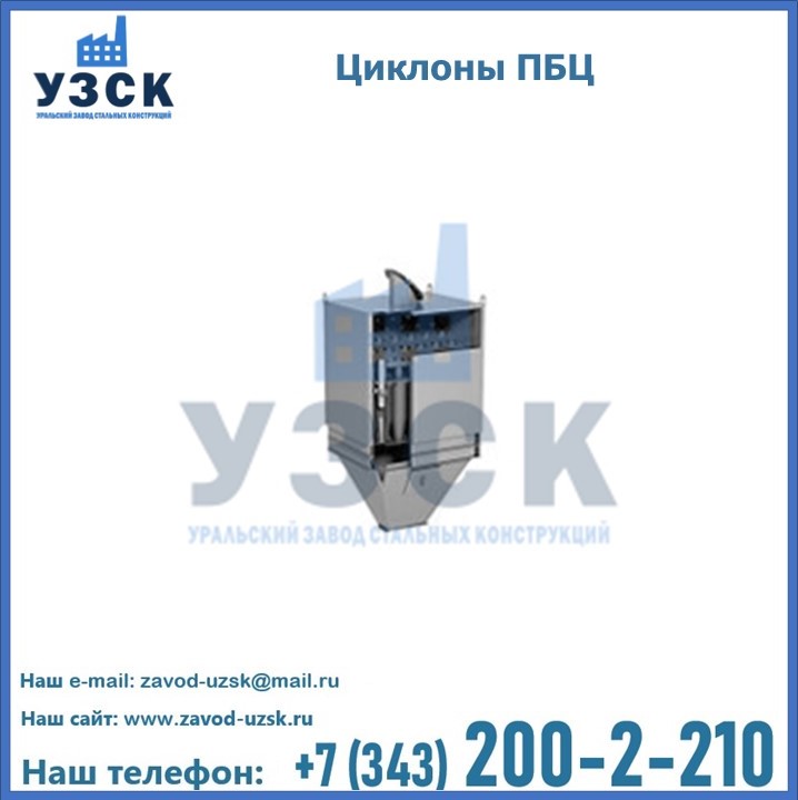 Завод «УЗСК» в Орехово-Зуево предлагает приобрести циклоны ПБЦ и прочие устройства, полностью укомплектованные и готовые к эксплуатации. Мы гарантируем соответствие оборудования всем требованиям ГОСТ и ТУ, износостойкость и высокую производительность предлагаемого оборудования. Уральский Завод Стальных Конструкций изготавливает и продает надежное, эффективное и производительное оборудование, имеющее длительную гарантию и большой эксплуатационный ресурс. Если требуется изготовить циклон нестандартных размеров, то такой вариант выполнения заказа тоже предусмотрен, так как предприятие имеет собственные производственные площади и надежных поставщиков. На все поставляемое или производимое оборудование имеются чертежи и прочая техническая документация. Заказать и купить циклоны или прочее оборудование высокого качества и по доступной цене можно через наш сайт или по указанному в разделе «Контакты» телефону.